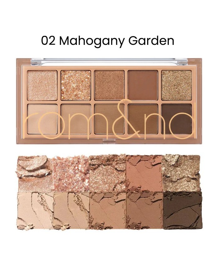 Rom&nd - Better Than Palette - 02 Mahogany Garden - o paleta de 10 farduri de ochi cu finisaje mate, stralucitor si sclipitor. Contine o compozitie de nuante de maro, bej si auriu.