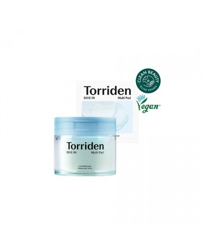 Torriden DIVE-IN Low Molecule Hyaluronic acid Multi Pad contine 80 dischete hipoalergenice infuzate cu Acid Hialuronic Complex 5D pentru a lăsa pielea plină și hidratată.