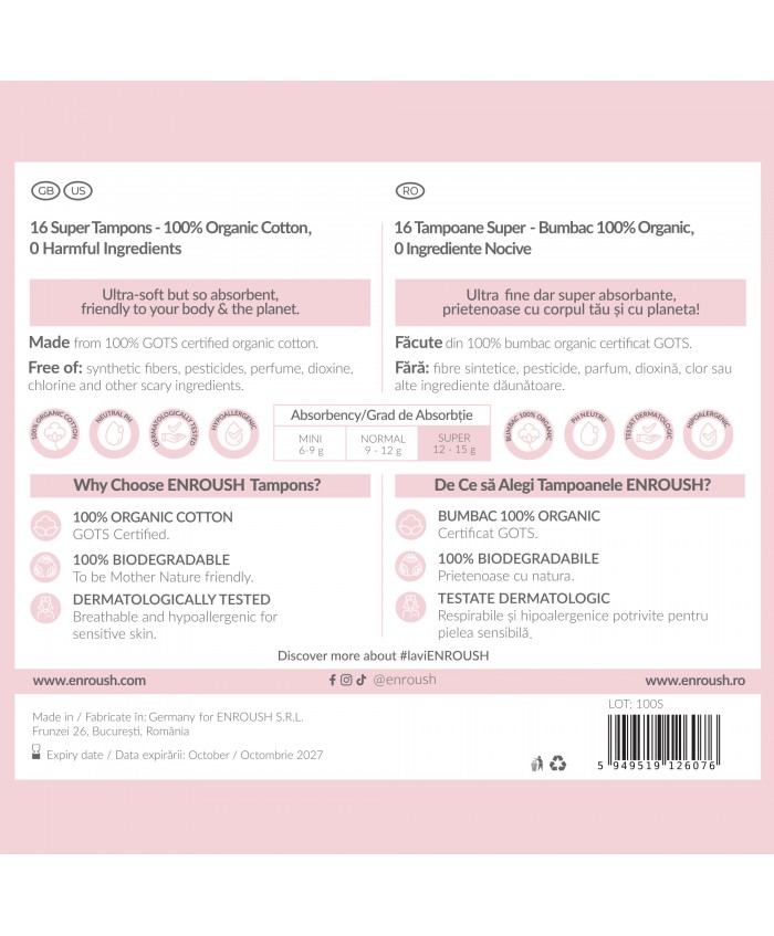 Absorbantele Enroush din bumbac organic SUPER sunt concepute pentru a oferi protectie maxima si confort pe durata menstruatiei. Fabricate din 100% bumbac organic certificat GOTS si fibre naturale, acestea sunt o alternativa sigura si delicata pentru pielea sensibila.