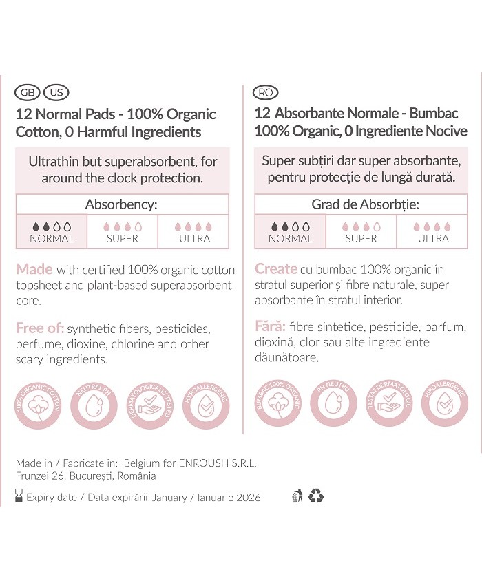 Absorbantele Enroush din bumbac organic pentru flux normal sunt ideale pentru a oferi o protectie eficienta si confortabila in timpul menstruatiei.