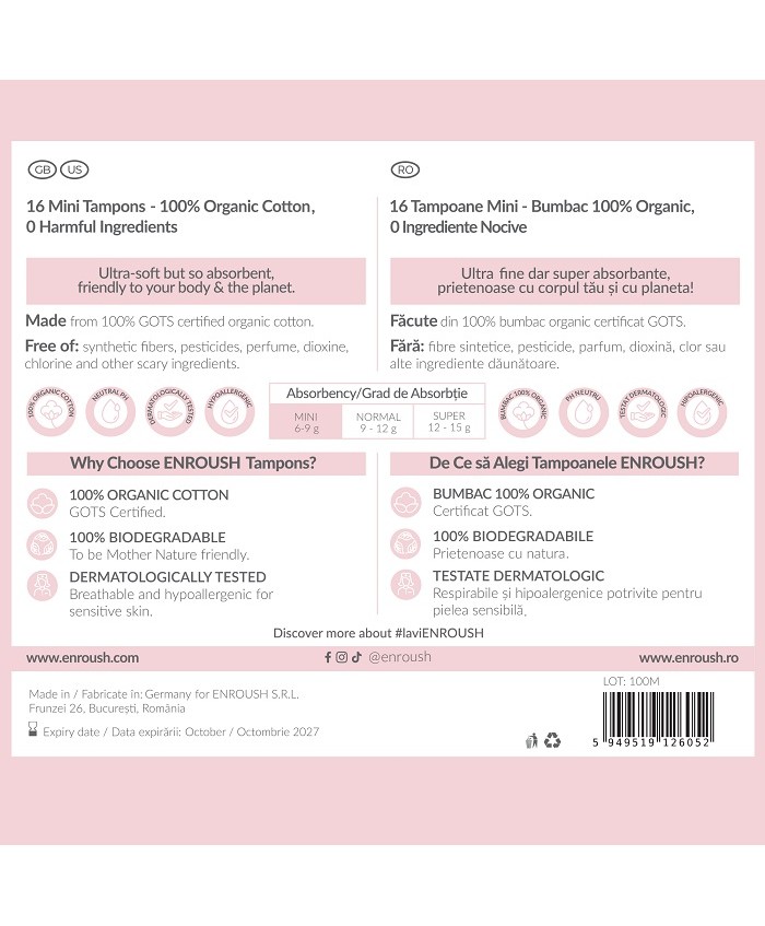 Tampoanele Enroush Mini din 100% bumbac organic certificat GOTS sunt special create pentru zilele cu flux menstrual redus, oferind protectie delicata, siguranta si confort maxim. Fara chimicale nocive, aceste tampoane sunt potrivite chiar si pentru pielea cea mai sensibila.