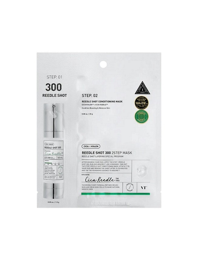 Primul pas contine Reedle Shot 300 de la VT, un tratament pentru piele formulat cu CICAHYALON™ pentru ingrijire hidratanta si linistitoare. Este alimentat de Cica Reedle™, o tehnologie inovatoare de ingrijire a pielii care imita tratamentul cu microneedling pentru a furniza ingrediente active cu molecularitate scazuta adanc in piele.