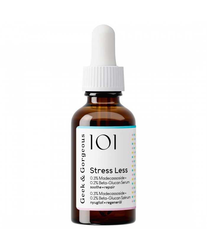 Stress Less, ser cu concentratie mare de Beta-Glucan- extras din ovaz si Madecassoside- extras din Centella Asiatica, doua super molecule cu abilitati remarcabile de calmare, reparare si hidratare a pielii. Conceput special pentru a ajuta tenul sensibil, deteriorat, iritat sau deshidratat.