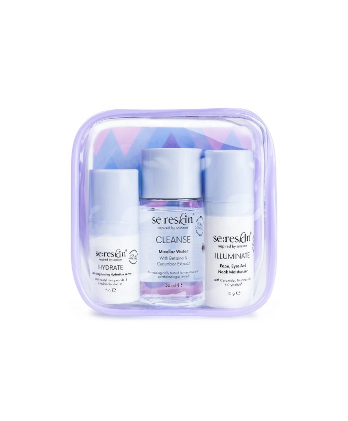 Un travel kit ce contine rutina minimalista completa de ingrijire a tenului: curatare, calmare, hidratare, intinerire si iluminare. Potrivite pentru a fi folosite impreuna sau oricand integrate alaturi de alte produse. Contine apa micelara Cleanse la 30 ml, serul Hydrate la 5 mg si crema Illuminate la 10 mg.
